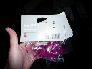 Hot glue hooks in place. We skipped this step and had to go back. The hooks from IKEA were perfect with the flat curtain rod because the small end fit but they also come off very easily. Two days of picking up hooks brought out that glue gun!